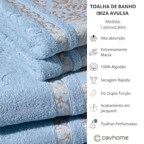 Principais Características: Material Premium: confeccionada com fio 100% algodão convencional de dupla torção, garantindo alta absorção e toque suave.Tecido Nobre: produzida em tear Jacquard, o que resulta em um tecido sofisticado e durável, reconhecido pela sua complexidade e qualidade.Design Exclusivo: arabescos elegantes e barrado com detalhes dourados que valorizam o ambiente.Tamanho Generoso: toalha de banho gigante, Banhão, com medidas de 0,80 x 1,60 m, perfeita para envolver seu corpo com conforto.Gramatura Ideal: 450 g/m², oferecendo equilíbrio perfeito entre maciez e resistência. Conteúdo do Produto: 01 Toalha de banho gigante  Cuidados e Recomendações: