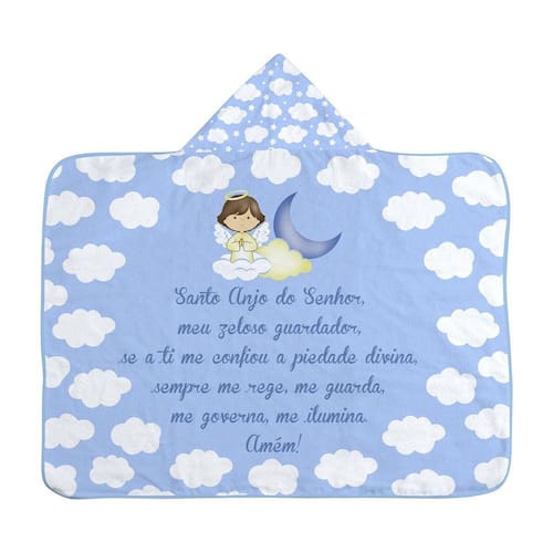 . Detalhes: possui estampa com a oração reconfortante do Santo Anjo do Senhor.