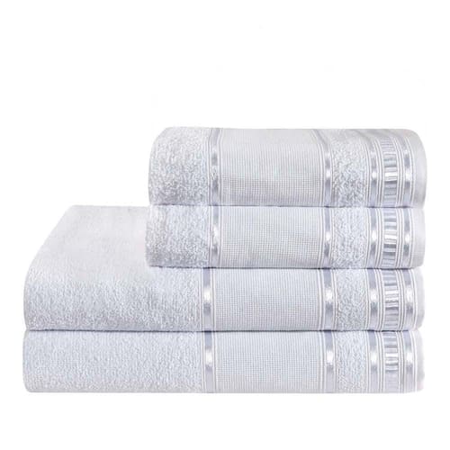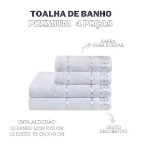 Este jogo de toalhas conta com 4 peças, sendo 2 toalhas de banho e 2 toalhas de rosto. As toalhas de banho possuem medidas aproximadas de 1,25m x 65cm, enquanto as toalhas de rosto possuem medidas aproximadas de 65cm x 45cm.