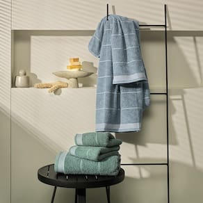 As Toalhas Scala possuem design moderno, com listras contínuas em fio branco que percorrem o corpo das toalhas, criando um interessante contraste.