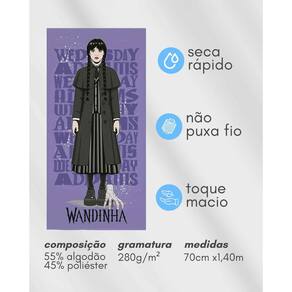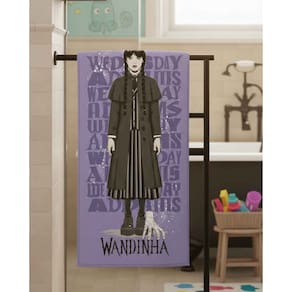 Toalha Infantil de Banho Wandinha Aveludada 70×1,40m Lepper Transforme o momento do banho ou da praia em um instante de alegria e conforto com esta toalha aveludada estampada da personagem Wandinha.Com medidas de 70 cm × 1,40 m, ela oferece o tamanho perfeito para envolver-se com leveza ou estender confortavelmente. Produzida em 55% algodão e 45% poliéster, e com gramatura de 280 g/m², combina absorção eficaz, toque macio e acabamento que seca rapidamente, ideal para uso diário ou como item estiloso de suplementação da rotina. Além disso, o tecido resistente evita que puxe fios, preservando a qualidade e a estampa por mais tempo. A estampa da icônica Wandinha sai do seriado e leva o universo pop-gótico para o banho ou lazer. Marca: LepperMedidas: 70 cm (largura) × 1,40 m (comprimento)Composição: 55% algodão / 45% poliéstesGramatura: 280 g/m²Características: tecido aveludado, secagem rápida, não puxa fio, toque macioEstampa: personagem Wandinha (Família Adams)Se você quer uma peça que una design temático + qualidade para o dia a dia, essa toalha é a escolha certa.Enrole-se no mistério estiloso da Wandinha e torne o banho num momento digno de série!