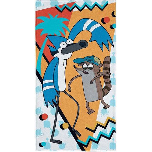 Toalha de Banho Infantil Regular Show Aveludada Transfer A toalha aveludada ilustra os personagens Mordecai, fazendo uma divertida careta e, Rigby usando um boné. Ao fundo, há muitas formas geométricas em tons de amarelo, laranja, azul e preto. Colorida e divertida é ideal para enxugar e divertir os garotos após o banho ou piscina. Confeccionado em algodão e poliéster, muito confortável e com excelente absorção, é o presente ideal para a garotada! Imagens meramente ilustrativas. Todas as informações divulgadas são de responsabilidade do fabricante/fornecedor. Marca Lepper Coleção/Sortimento Regular Show Tecido Algodão; Poliéster Conteúdo e Medidas 1 toalha aveludada 75x140cm Cor Amarelo Estampada Sim Felpuda Não Bordada Não