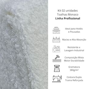 Cada kit contém 02 peças de toalhas de banho profiline Monaco, com medidas de 0,70x1,35m. Essas toalhas são brancas, garantindo um aspecto limpo e profissional para o seu estabelecimento.