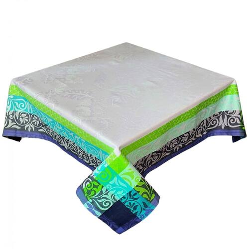 Toalha de chá Portuguesa Spring 1.00x1.00m, em tecido Jacquard 100% Algodão 210 gr/m2. Desenho floral com barra localizada. Pode ser usada como centro de mesa ou toalhinha de chá.