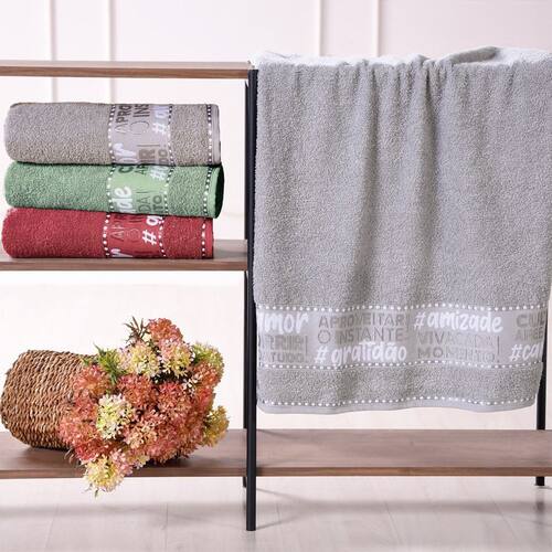 Essa incrível tolha possui uma barra com lindas palavras inspiradoras para deixar a hora do seu banho ainda mais aconchegante e relaxantes. Uma toalha completa em todos os quesitos, desenvolvida em cores atuais, gramatura de 400 g/m², com um toque super macio e uma excelente absorção.