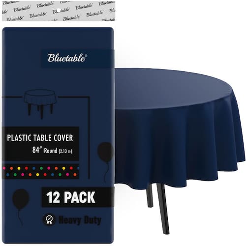 - Cada pacote contém 12 toalhas de mesa de plástico descartáveis azul marinho de 213 cm, perfeitas para todas as mesas redondas padrão