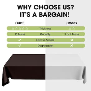 - Opção econômica: nossas toalhas de mesa descartáveis para festas vêm em uma variedade de cores vivas para escolher. Seja para jantar interno/externo, decoração ou uso diário, nosso pacote com 10 é uma opção econômica.