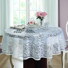 A Toalha de Mesa Lepper redonda Renda Rosas possui característica romântica com pontos que evidenciam flores e delicados arabescos.