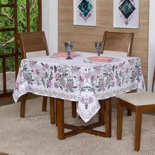 Contem: 01- toalha de mesa quadrada 1,50 x 1,50 4 lugares Composição: 100% poliéster Tecido: poliéster