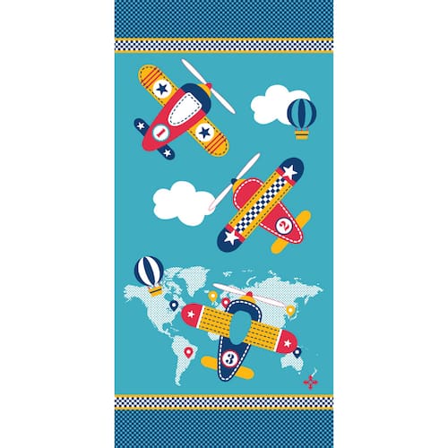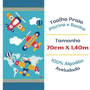 Aventura e conforto nas alturas! A estampa da Toalha repleta de aviões e balões deixa a praia divertida e cheia de estilo. Ela é felpuda e o tecido 100% algodão traz conforto e maciez para seu pequeno.