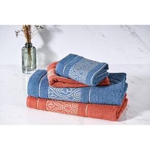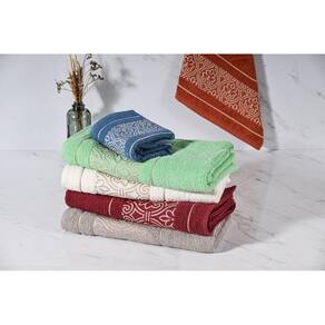 Ela é produzida com fio 100% algodão convencional de dupla torção, proporcionando melhor absorção e conforto. Seu corpo e barrado possuem lindos desenhos arabescos em fio metalizado dourado.