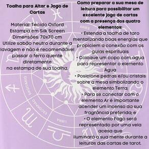 Toalha Jogo de Cartas Zodíaco 70 x 70 cm Lilás Toalha Jogo de Cartas Zodíaco 70 x 70 cm Lilás A Toalha Jogo de Cartas Zodíaco da Bialluz é ótima para te auxiliar durante o jogo de cartas, por ser um elemento que proporciona alta elevação enérgica. Você também pode usar para decorar seu altar, com certeza ficara ainda mais lindo e com muita energia positiva. Nossa toalha possui altíssima qualidade na impressão com pontos de brilho e é confeccionada em tecido oxford que não amassa e tem longa durabilidade. Enviamos a sua toalha em até 24 horas após a confirmação de pagamento Dimensões aproximadas:Altura: 70 cmLargura: 70 cm Tecido: Oxford Caso tenha alguma dúvida nos mande mensagem que respondemos rapidinho para te ajudar da melhor forma possível Desejamos boa sorte em seu jogo Marca: Meta Atacado