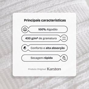 Desenvolvidas pela Karsten com exclusividade para a BF Casa, as toalhas Brisa são felpudas e indispensáveis para tornar seu momento de banho ainda melhor. Feitas em 100% algodão com gramatura premium de 430 g/m², elas cuidam da sua pele com toque macio e alta absorção desde o primeiro uso. As toalhas banhão têm medidas generosas (85cm x 150cm), perfeitas para envolver o corpo todo em bem-estar. Os fios de fibras longas possuem a tecnologia SoftMax, que garante textura encorpada e toque suave e agradável na pele. Perfeita para quem busca uma sensação acolhedora e suave de brisa na pele fresca pós-banho. As toalhas Brisa ainda trazem uma textura em jacquard, detalhe canelado e lindas opções de cores, proporcionando charme para o seu banheiro. Este kit inclui a toalha de piso Metrópole, da Karsten. Também feita em 100% algodão, e com uma gramatura incrível de 500g/m². Características que fazem a diferença: 100% algodão Gramatura 430g/m²: alto padrão Alta absorção desde o primeiro uso Tecnologia SoftMax: mais maciez, volume e absorção Felpa volumosa: sensação suave que massageia a pele Pré-lavada e pré-encolhida: mantém tamanho e qualidade após as lavagens Textura Jacquard e acabamento sofisticado: mais charme para o ambiente Produção exclusiva Karsten: indústria com mais de 140 anos de tradição, qualidade e inovação no Brasil. Ficha técnica do jogo de toalhas Brisa: Composição: 100% Algodão. Gramatura: 430g/m² (Toalhas de banho e rosto) / 500g/m² (Piso). Marca: Karsten (Exclusividade BF Casa). Modelo: Brisa. Quantidade de Peças: 5 itens. Conteúdo e Dimensões: 02 Toalhas Banhão (86cm x 150cm). 02 Toalhas de Rosto (48cm x 80cm). 01 Toalha de Piso Metrópole (45cm x 65cm). Cuidados para garantir a durabilidade das toalhas Lave tipos de tecidos distintos separadamente; Não lave cores claras e cores escuras no mesmo ciclo; Lave as peças no ciclo leve, suave ou delicado de sua lavadora; Enxágue as peças com bastante água; Utilize a quantidade mínima de amaciante e sabão; Ao pendurar as toalhas, recomenda-se sacudí-las bem; Leia atentamente as instruções na etiqueta. Marca: Não Informado