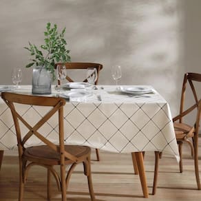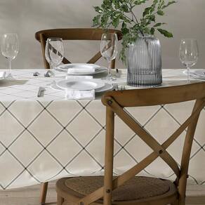 Toalha de Mesa com acabamento especial Dhler Clean, que protege e permite limpar facilmente, basta passar um pano de imediato. Tecido misto 50% algodão 50% poliéster, 170 g/m.