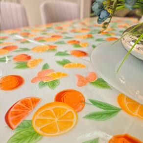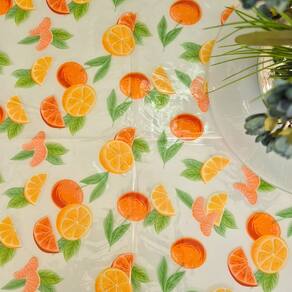 Toalha Mesa TRANSPARENTE com ESTAMPAS 1,40mx1,40m Estampa 07 Laranja Com estampas vibrantes a Toalha Mesa TRANSPARENTE com ESTAMPAS possui uma plastificação que a torna impermeável e por isso, ela é responsável por proteger a sua mesa das danos do dia-a-dia, e trazer ainda mais personalidade para sua cozinha. A TOALHA DE MESA é de fácil instalação e limpeza pois pode ser higienizada somente com um pano úmido ou então com sabão neutro e o lado macio da bucha.