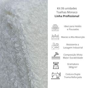 Características técnicas: - Kit com 06 toalhas de banho profiline mônaco 0,70x1,35m - Alta absorção e maciez - Resistência à lavagem industrial e ao cloro - Gramatura: 380g/m - Cor: branca - Composição: 90% algodão / 10% poliéster Ean: 7893489987152