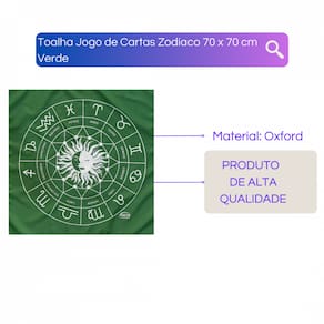 Toalha Silk Jogo Cartas Tarot Zodíaco 70x70cm- Selecione Cor A Toalha Silk Jogo Cartas Tarot Zodíaco da Bialluz são ótimas para te auxiliar durante o jogo de cartas, por ser um elemento que proporciona alta elevação enérgica. Você também pode usar para decorar seu altar, com certeza ficara ainda mais lindo e com muita energia positiva. Nossa toalha possui altíssima qualidade na impressão com pontos de brilho e é confeccionada em tecido oxford que não amassa e tem longa durabilidade. Escolha um dos modelos disponíveis na opção COR do próprio anúncio. Enviamos a sua toalha em até 24 horas após a confirmação de pagamento! Dimensões aproximadas: Altura: 70 cm Largura: 70 cm Tecido: Oxford Caso tenha alguma dúvida nos mande mensagem que respondemos rapidinho para te ajudar da melhor forma possível! Desejamos boa sorte em seu jogo! Marca: META ATACADO