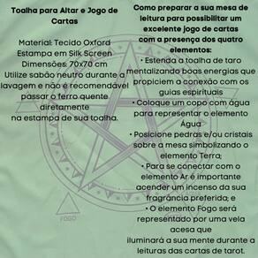 A Toalha Tecido Jogo de Cartas Pentagrama da Bialluz é ótima para te auxiliar durante o jogo de cartas, por ser um elemento que proporciona alta elevação enérgica. Você também pode usar para decorar seu altar, com certeza ficara ainda mais lindo e com muita energia positiva. Nossa toalha possui altíssima qualidade na impressão com pontos de brilho e é confeccionada em tecido oxford que não amassa e tem longa durabilidade.