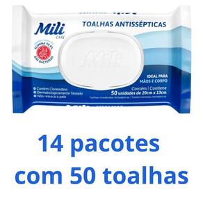 Embalagem com 14 pacotes de 50 unidades, totalizando 700 toalhas Experimente a praticidade aliada à segurança com as Toalhas Umedecidas Mili Antissépticas.