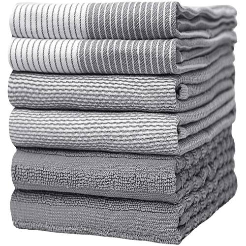 Toalhas de cozinha premium (51 x 71 cm, pacote com 6) | Toalha de mão grande de algodão | Panos de prato planos e felpudos | Conjunto de toalhas de chá altamente absorventes com laço para pendurar | - MACIO E ABSORVENTE: Feito de 100% algodão fiado em anel para ajudar a manter sua casa limpa e higiênica. Nossas toalhas são laváveis na máquina e reutilizáveis. Eficaz para absorver mais do que toalhas de papel - Ecológico: toalhas de mão absorventes para um ambiente mais saudável e limpo para sua casa. Eles mantêm sua aparência e sensação através de vários ciclos de lavagem - Pacote com 6: contém três texturas diferentes de toalhas, incluindo uma toalha plana e uma toalha felpuda. Ótimo para secar pratos, limpar bancadas de cozinha, limpar derramamentos e muito mais - CAIXA DE PENDURAR E BOLSA DE BÔNUS INCLUÍDO: As toalhas de cozinha Bumble vêm com uma sacola elegante, tornando-a um ótimo presente para entes queridos - CUIDADO COM SUAS TOALHAS: Lavar à máquina com água morna e secar em temperatura baixa. Recomendamos lavar antes do primeiro uso para remover qualquer excesso de fiapos do processo de fabricação. Sempre lave suas toalhas separadamente para evitar a transferência de fiapos para suas roupas.
