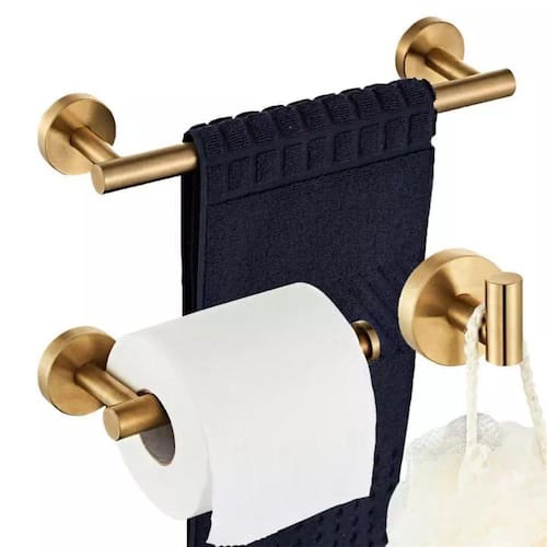 Este Kit Formidável vai conquistar vocêTransforme seu Banheiro ou Lavabo em um ambiente incrível e agradável com estes acessórios para banheiro de alta qualidadeEste Kit acessórios para Banheiro na cor Dourado foi idealizado para deixar o seu banheiro organizado e sofisticado dando lhe um toque de elegância e requinte.Conjunto de Toalheiro com 3 peças.Material: 304 aço inoxidávelCor: douradoCapacidade de rolamento: 30 KGO pacote inclui:1 x Suporte Toalha Rosto Gancho1 x Suporte de Toalha Barra1 x Suporte Papel HigiénicoProduto de alta qualidade material de aço inoxidável 304, grosso e pesado mostrando resistência , durável e não-deformável, com excelente dureza e estabilidade, resistência à oxidação, fácil montagem, anti-ferrugem.Ótima escolha para atender às suas diferentes necessidades.Acompanha parafusos, buchas para instalação. Marca: Casa Palhano