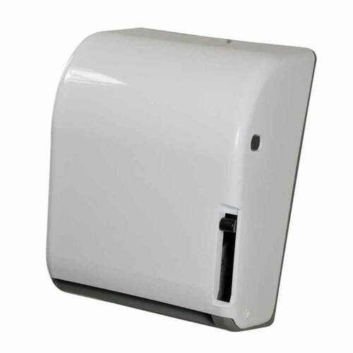 Dispenser em ABS para papel bobina (até 200m) possui alavanca que auxilia a liberação do papel, evitando o desperdício.
