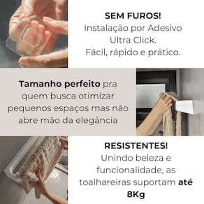 A instalação do Toalheiro Eleve é simples e prática através de um adesivo forte e resistente que se adapta a diversos tipos de revestimento, seja parede, papel de parede, porcelanatos, madeiras entre outros.