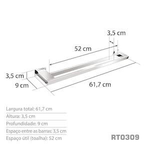 Informações gerais do produto: Toalheiro Duplo 60 cm, utilizado para pendurar toalhas de banho e casal. Produto prático, resistente, funcional e com design moderno, atual e inspirado em inovação e sofisticação de modelos europeus, marcados pelo bom gosto. Pode ser instalado em banheiros, lavatórios ou lavabos oferecendo grande praticidade e beleza ao ambiente, agradando a todos os gostos. Produzido em aço inoxidável e com o acabamento polido, reforçando alta qualidade, resistência, robustez e facilidade na limpeza. Fabricado com matéria prima nobre e seu design diferenciado, moderno, versátil e elegante, garante uma excelente opção de compra e a certeza de uma ótima composição com qualquer estilo de decoração.