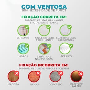 Importante: - Remover regularmente (a cada 3 meses) e reaplicar conforme instruções de montagem. - Nunca utilize este produto com peso superior ao indicado. - Não utilize este produto para acomodar produtos frágeis e de valor. - Não use chaves, facas e objetos pontiagudos para retirar o produto da superfície. - Não aplicar em superfícies com pintura recente (inferior a 30 dias).