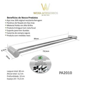 Características: ? Material Premium: Aço Inox 304 — resistência superior à corrosão e longa vida útil. ? Design Duplo: Dois níveis paralelos com 80 cm de largura — maior capacidade para toalhas de banho ou uso conjunto. ? Acabamento Polido: Superfície brilhante com efeito espelhado — mais sofisticação para o ambiente. ? Fixação Oculta: Instalação discreta com visual limpo — sem parafusos aparentes. ? Versátil e Elegante: Indicado para banheiros residenciais, suítes e lavabos refinados. ? Estilo Atemporal: Combina com ambientes clássicos, modernos ou minimalistas. ? Instalação Fácil: Fixação segura com kit completo e manual prático. ? Durabilidade Garantida: Produto com 5 anos de garantia contra defeitos de fabricação.