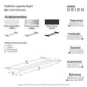 O porta toalhas toalheiro duplo da linha Orion possui um design versátil, é uma peça que se destaca com minimalismo. Além de decorar, organiza com funcionalidade o banheiro. Criado em metal nobre com uma qualidade que abrange áreas litorâneas e possui a de um acabamento muito resistente. Agora é só você adquirir este lindo acessório e fazer o seu projeto se tornar realidade com um banheiro prático para toda a sua família. Características Fabricado em metal alumínio. Disponível no Prata Alto Brilho, Escovado e Preto Fosco. Pode ser instalado em parede, azulejo e porcelanato. Benefícios Fixação prática e segura com parafusos e buchas inclusos. O produto não possui nenhum detalhe em plástico ABS . Fácil higienização, ideal para locais que exigem limpeza constante. Aproveitamento inteligente do espaço, ideal para ambientes compactos. Resistente à corrosão e luz solar. Itens ENVIADOS: 1 toalheiro duplo 40cm, kit de parafusos e manual instrução instalação. Instalação INTELIGENTE Ao 1º furo, use uma broca medida menor, após use a medida correta e finalize, vai ajudar na precisão da fixação da bucha principalmente em azulejos e porcelanato. Marca: Não Informado