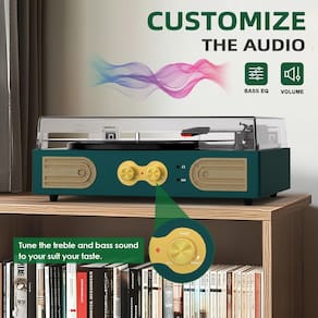 -?Som ajustável de graves/agudos?Projetado para um desempenho superior, este toca-discos de vinil combina um pedestal suspenso por mola e pés de borracha para eliminar as vibrações do motor, garantindo uma reprodução perfeita do vinil. Com controles adicionais de agudos e graves, você pode personalizar o áudio com perfeição para uma experiência auditiva envolvente.