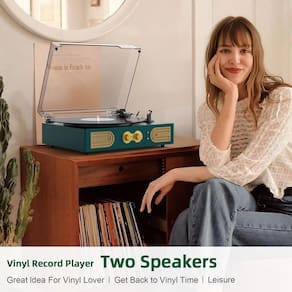 -?Toca-discos ideal para presente?Combinação de reprodução clássica de vinil com conectividade moderna, fácil de usar para quem quer curtir sua coleção de músicas de várias maneiras. Ele oferece o calor do vinil com a conveniência da tecnologia atual, e sua elegante cor verde e design portátil o tornam um presente ideal para aniversários e Natal.