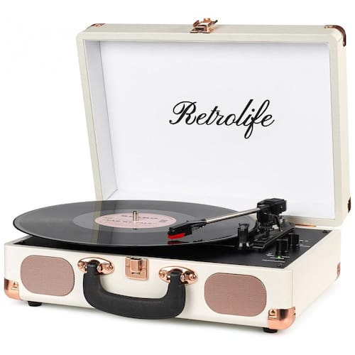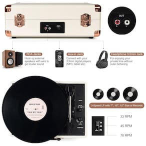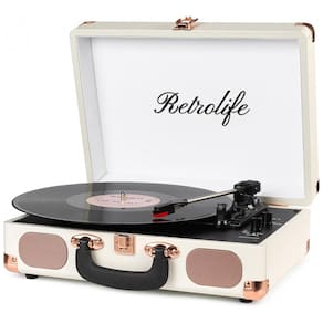 O Toca-discos Retrolife é uma combinação perfeita de elementos modernos e vintage. Com design clássico em couro PU preto, parafusos e redes de metal bronze retro, este toca-discos de maleta é perfeito para levar para todos os lugares com sua alça sólida. Desfrute de criar suas próprias memórias musicais. Suporta 3 tamanhos de discos de vinil (7, 10, 12 polegadas) e 3 velocidades de reprodução (33, 45, 78 RPM) para uma qualidade de som superior. Conectividade Bluetooth integrada, saída RCA, entrada Auxiliar e saída para fone de ouvido para diversas opções. Possui um interruptor de parada automática, modo de troca rápida e é fácil de configurar, ideal para iniciantes e entusiastas de vinil.