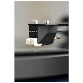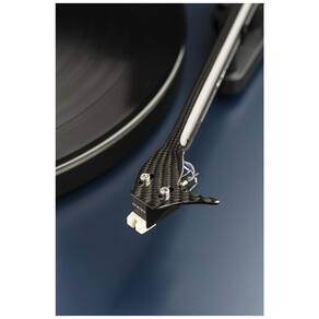 Braço de fibra de carbono de peça única de 20cm, headshell integrado. Seleção eletrônica de velocidade para 33 e 45 RPM capacidade para 78. Rolamentos de braço de safira de precisão de baixa fricção. Cartucho phono Sumiko Rainier, montado de fábrica e alinhado com precisão. Prato de aço estampado pesado de 1,7 kg com amortecimento TPE