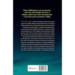 Stacy Willingham nos presenteia com um novo thriller de tirar o fôlego, sobre uma mãe desesperada em sua luta para encontrar o filho, revelando um passado repleto de segredos sombrios. Há exatamente um ano, a vida de Isabelle Drake mudou para sempre: seu filho pequeno, Mason, foi tirado do berço no meio da noite, enquanto ela e o marido dormiam no quarto ao lado. Com poucas pistas e evidências sobre o paradeiro do menino, a polícia acaba deixando o caso esfriar muito rapidamente. E, por conta do desconforto ocasionado pelo trauma de perder o filho, Isabelle não consegue dormir uma noite sequer, exceto por um cochilo ocasional ou pequenos apagões que sofre em decorrência da sua abstinência de sono. Agora, toda a existência dessa mãe gira em torno de encontrar a criança, mas ela sabe que não pode continuar assim para sempre. Na esperança de encontrar uma ponta solta, uma nova testemunha ou uma nova pista enterrada, Isabelle concorda em ser entrevistada por um podcaster famoso por investigar crimes reais, ainda que o interesse dele no passado dela a deixe inquieta. A torrente de perguntas desse homem, junto com a insônia severa, traz à tona memórias desconfortáveis de sua própria infância, de sua mãe e de seu passado. A partir daí, começa a duvidar das lembranças que guarda da noite do desaparecimento de Mason, e também passa a questionar em quem pode confiar… incluindo ela mesma.