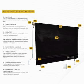 Toldo Cortina Retrátil sem visor conforme medida anunciadaBandô de acabamento:15cmAcionamento manual lado direitoTecido: Lona PVC 550g/m e espessura de 0,45mmTubos internos em ferro galvanizado Redutor, buchas e suporte de fixação em alumínio02 mosquetões e suporte de base em inoxparafusos com bucha para fixação no teto ou paredeparafusos com bucha para fixação do suporte de base01 haste de manobra/manivela 1,20m em alumínio