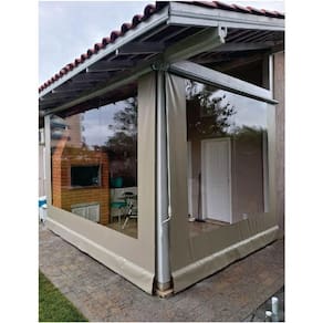 Toldo Cortina Retrátil Com visor: Bandô de acabamento:15cmAcionamento manual lado direito Tecido: Lona PVC 550g/m e espessura de 0,45mmTubos internos em ferro galvanizado Redutor, buchas e suporte de fixação em alumínio02 mosquetões e suporte de base em inoxparafusos com bucha para fixação no teto ou paredeparafusos com bucha para fixação do suporte de base01 haste de manobra/manivela 1,20m em alumínio