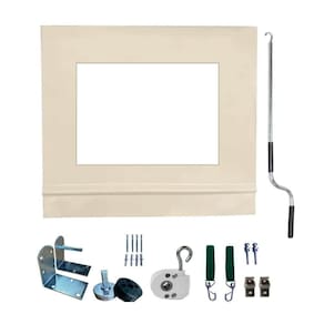 Toldo Cortina Retrátil Com visor: Bandô de acabamento:15cmAcionamento manual lado direito Tecido: Lona PVC 550g/m e espessura de 0,45mmTubos internos em ferro galvanizado Redutor, buchas e suporte de fixação em alumínio02 mosquetões e suporte de base em inoxparafusos com bucha para fixação no teto ou paredeparafusos com bucha para fixação do suporte de base01 haste de manobra/manivela 1,20m em alumínio