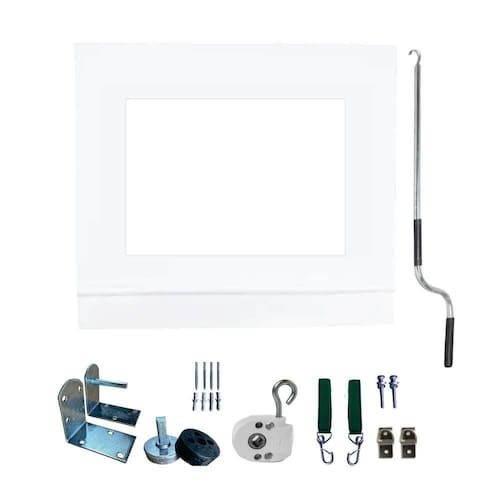 Toldo Cortina Retrátil Com visor: Bandô de acabamento:15cmAcionamento manual lado direito Tecido: Lona PVC 550g/m e espessura de 0,45mmTubos internos em ferro galvanizado Redutor, buchas e suporte de fixação em alumínio02 mosquetões e suporte de base em inoxparafusos com bucha para fixação no teto ou paredeparafusos com bucha para fixação do suporte de base01 haste de manobra/manivela 1,20m em alumínio