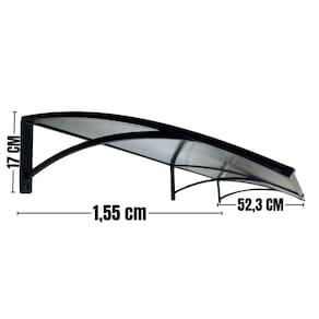 Design Moderno e Durável: Com uma profundidade de 52,5cm e uma largura de 150cm, nosso toldo é construído com policarbonato de alta resistência, oferecendo durabilidade excepcional e proteção contra raios UV.