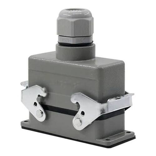 A carcaça da tomada é feita de alumínio, um material durável e resistente. Sua cor cinza e revestimento em pó a alta temperatura proporcionam um acabamento estético e proteção contra desgaste.