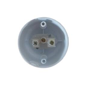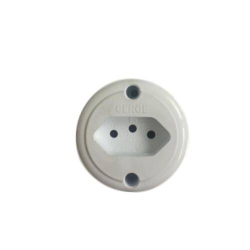 Tomada externa de sobrepor. Compatível com tomadas 3 ou 2 pinos macho 10 A. Tensão máxima suportada 250 V AC. Corrente máxima 10 A. O fundo é aberto, conforme foto. Não acompanham parafusos. Em termoplástico na cor branca. Altura 4,5 cm, diâmetro 5,5 cm. Peso 35 g. Marca: Gerge
