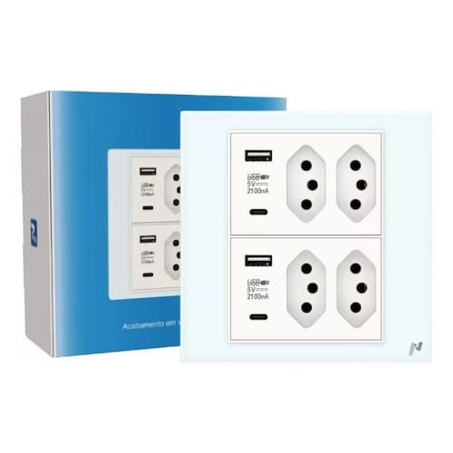 4 TOMADAS+USB+TIPO C - B/W Tensão de entrada: 100-265 V AC 50/60Hz Suporta pinos de 10A e 20 A Tamanho do pino: 4,8 mm (20A) Saída USB: 5V 1-2 /1A Saída tipo C: 5A 1-2 /1A Dimensões: 120x120 mm Classe de Inflamabilidade: V0 graus Material: ABS, vidro, metal, fosforo e cobre.