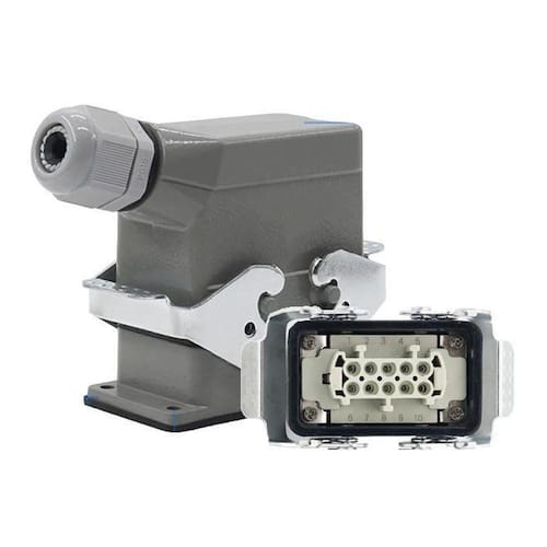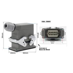 Itens do conjunto: 1 - Carcaça saída lateral + prensa cabo PG16 1 - Base baixa trava lateral 1 - Soquete macho 10 polos + terra 1 - Soquete fêmea 10 polos + terra