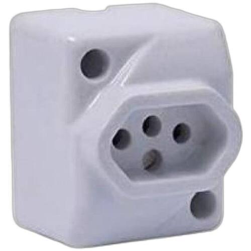Tomada de porcelana 2p+t Corrente: 25a compatível com os plugues 20a padrão abnt Tensão: até 250v Ideal para uso em equipamentos ou locais que produzem calor, ou com corrente maior do que 20a. Muito utilizado em churrasqueiras, fornos, cooktops entre outros. para utilização em churrasqueiras recomenda-se a ligação com cabos próprios para alta temperatura Obs: produto vendido é a unidade Medidas mm : larg: 53 x alt: 65 x prof: 50
