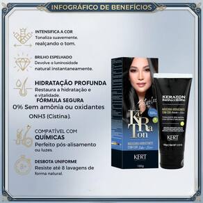 Keraton Banho de Brilho é uma máscara tonalizante hidratante com cor, vegana, indicada para ser aplicada entre colorações, e sempre que seus cabelos estiverem opacos e desbotados. Pode ser utilizado imediatamente após relaxamentos, alisamentos e permanentes ou entre colorações. Keraton realça a coloração dos cabelos, dando mais vitalidade e devolvendo o brilho natural, de forma extremamente suave e sem agredir as fibras. É ideal também para luzes e reflexos. Keraton Banho de Brilho não contém amônia nem oxidantes. Keraton Banho de Brilho é um excelente corretivo, pode ser aplicado também após uma coloração mal sucedida.