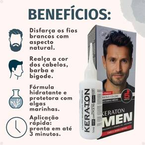 o Tonalizante Keraton men com Ormagel XPU é uma coloraçãosemi-permanente que foi desenvolvida com um exclusivo blend de algas marinhas, rico em biopolimeros hidratantes e protetores que auxiliam no tratamento dos cabelos, atuando nos fios como um filme protetor da cor. Tonaliza suavemente os fios brancos realçando a cor dos cabelos devolvendo-lhes uma aparência natural e saudável. Não contém amônia! Não danifica os cabelos. tonaliza cabelo, barba e bigode em 5 cores: Castanho escuro, Castanho médio, Castanho claro, Louro escuro e Cinza natural. Não testado em animais. Sempre faça o teste de mecha antes de aplicar o produto por todo o cabelo.