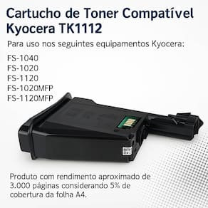 Toner Compatível TK-1112 para impressora FS1020 FS1020MFP FS1040 FS1120 FS-1020 FS-1120 FS-1120MFP Preto 3.000Especificações:Cartucho de Toner Compatível TK1112 - TK 1112Cor: Preto - Black - BKRendimento: média de 3.000 impressões com 5% de preenchimento no papel A4Tipo: Compatível.Estado: Novo, Lacrado e Pronto para o uso.Impressoras Compatíveis:FS1040FS1020FS1120FS1020MFPFS1120MFPFS-1040FS-1020FS-1120FS-1020MFPFS-1120MFPInformações Legais:Marcas e Modelos citados conforme Art. 31 do Código de Defesa do Consumidor (Lei no. 8.078/90) e Art. 132, inciso II, da Lei da Propriedade Industrial (no. 9.279/96).The brands cited in the ad belong to their respective manufacturers. Only mentioned as references for the correct use of the product, as Article 31 of the Act: 8078 of 11.09.1990.Rendimento médio informado conforme Norma ISO/IEC 19752.Imagens meramente ilustrativas. Marca: Não Informado