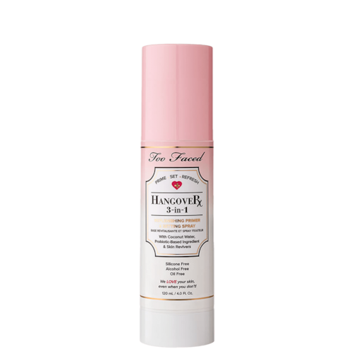 Primer em spray. Too Faced Hangover 3-in-1 ajuda a preparar, definir e refrescar o rosto antes e depois da maquiagem, além de manter a pele hidratada.